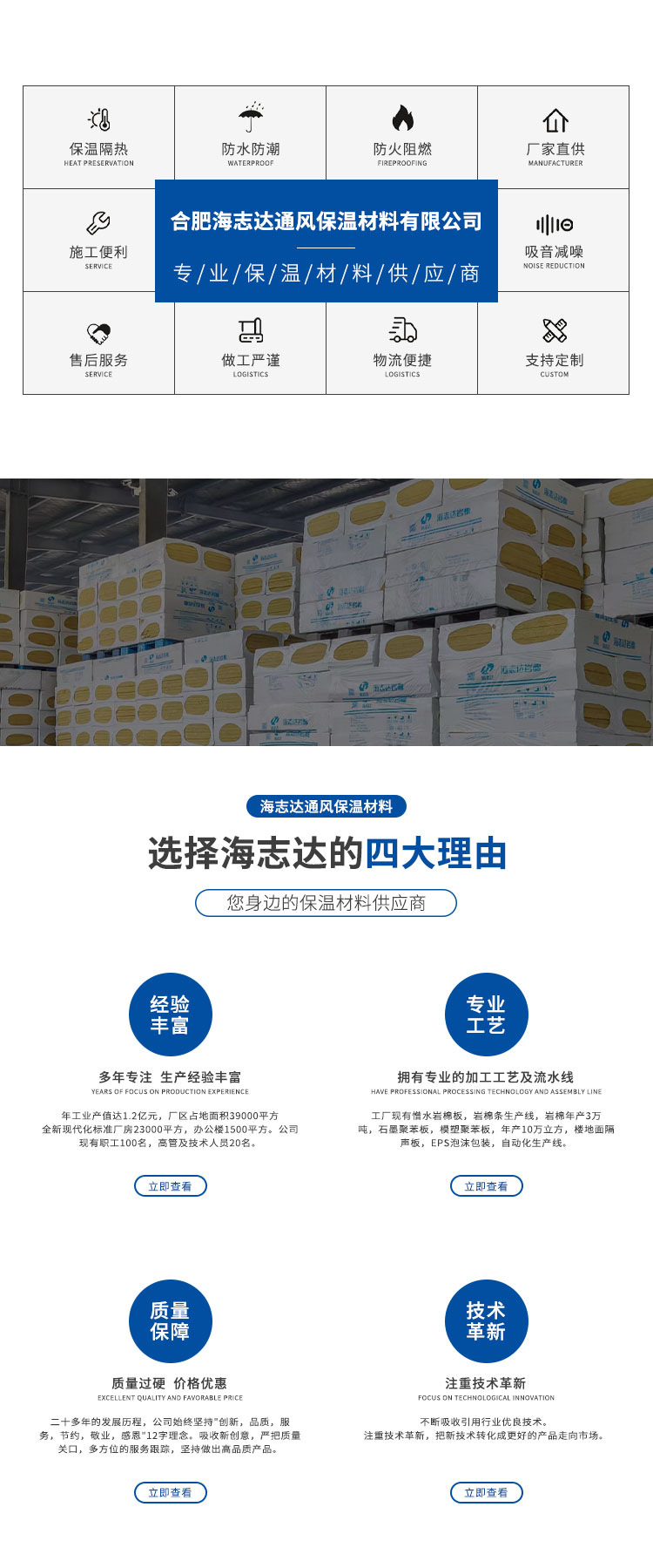 合肥海志達(dá)通風(fēng)保溫材料有限公司(原海豐泡沫廠(chǎng))成立于1998年,注冊(cè)資金2118萬(wàn),注冊(cè)商標(biāo)"海志達(dá)"系列產(chǎn)品廣泛用于建筑、電力、船舶、公路鐵路、航空等領(lǐng)域,年工業(yè)產(chǎn)值達(dá)1.2億元,廠(chǎng)區(qū)占地面積39000平方,全新現(xiàn)代化標(biāo)準(zhǔn)廠(chǎng)房23000平方,辦公樓1500平方。公司現(xiàn)有職工100名,高管及技術(shù)人員20名。工廠(chǎng)現(xiàn)有憎水巖棉板,巖棉條生產(chǎn)線(xiàn),巖棉年產(chǎn)3萬(wàn)噸,石墨聚苯板,模塑聚苯板,年產(chǎn)10萬(wàn)立方,樓地面隔聲板,EPS泡沫包裝,自動(dòng)化生產(chǎn)線(xiàn),公司擁有標(biāo)準(zhǔn)化產(chǎn)品實(shí)驗(yàn)室,企業(yè)并通過(guò)ISO9001質(zhì)量管理體系認(rèn)證和ISO14001環(huán)境管理體系認(rèn)證,工廠(chǎng)現(xiàn)座落于合肥市肥東縣梁園鎮(zhèn)梁園社區(qū),是安徽地區(qū)一家生產(chǎn)企業(yè)。